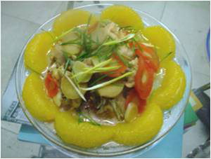 3. 오렌지나 장식용 야채를 접시에 동그랗게 옆으로 돌리고, 삶아낸 닭을 보기 좋게 담는다.